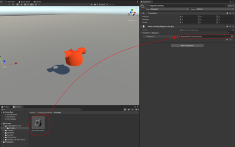 On this component you will see a dropdown option for clothes to register. Open up the drop down and click the little + to add a new clothing option. Now drag your prefab into this option to assign it.